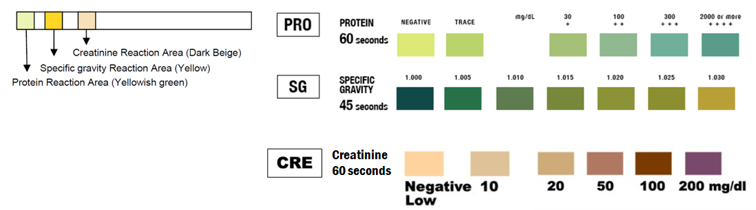 Testiä käytetään kreatiniinin, proteiinin ja virtsan tiheyden tarkistamiseen virtsanäytteistä. Testi antaa tuloksen visuaalisen vertailun avulla, joka on painettu pakkaukseen (katso alhaalta).